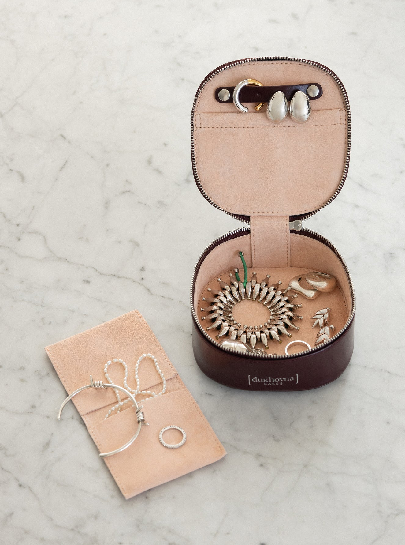 Вишневий кейс для твоїх цінних речей з персиковою підкладкою. Вишневий зовні, персиковий зсередини. Італійська шкіра й велюр. Мʼякий, як спогади про щасливе літо.