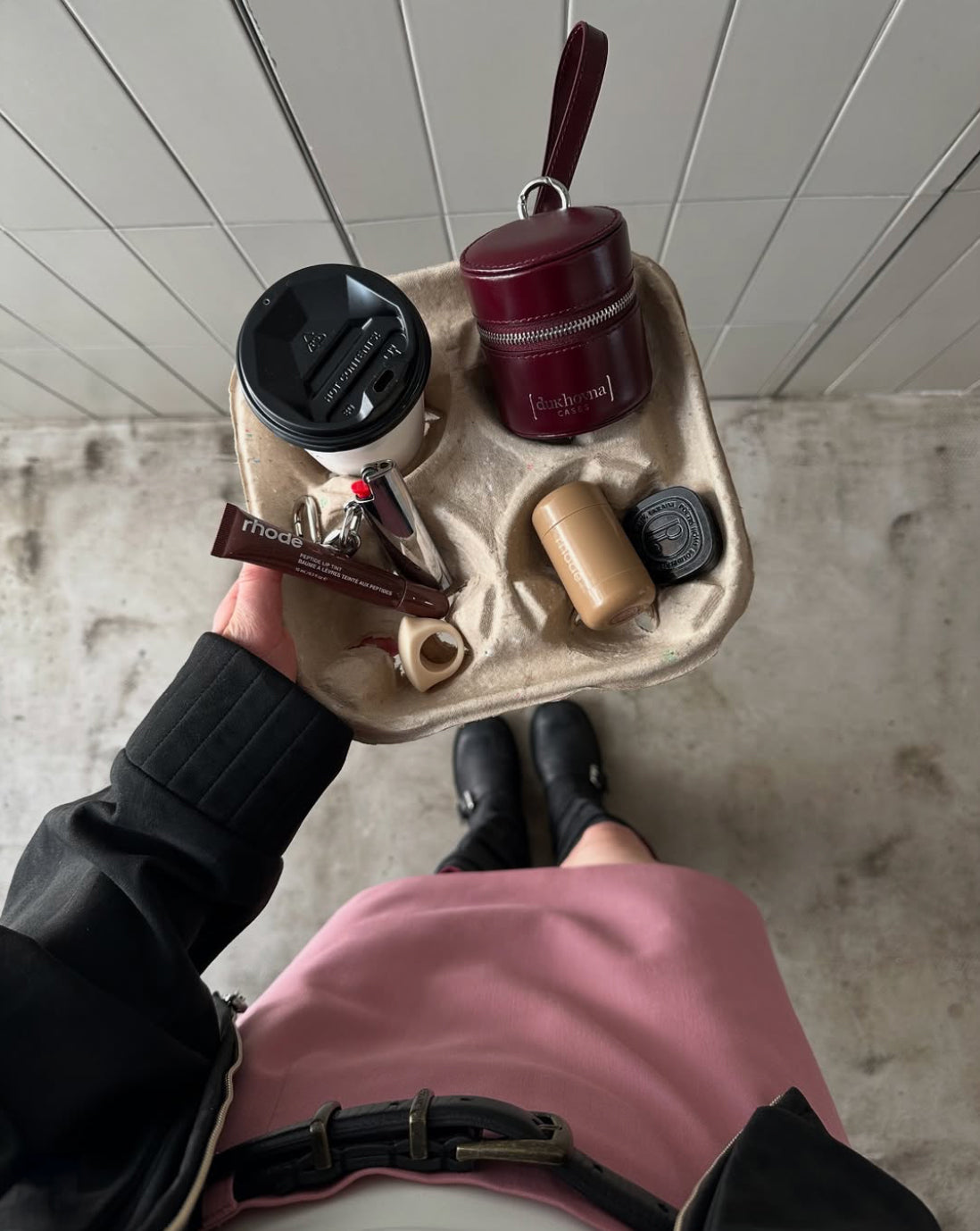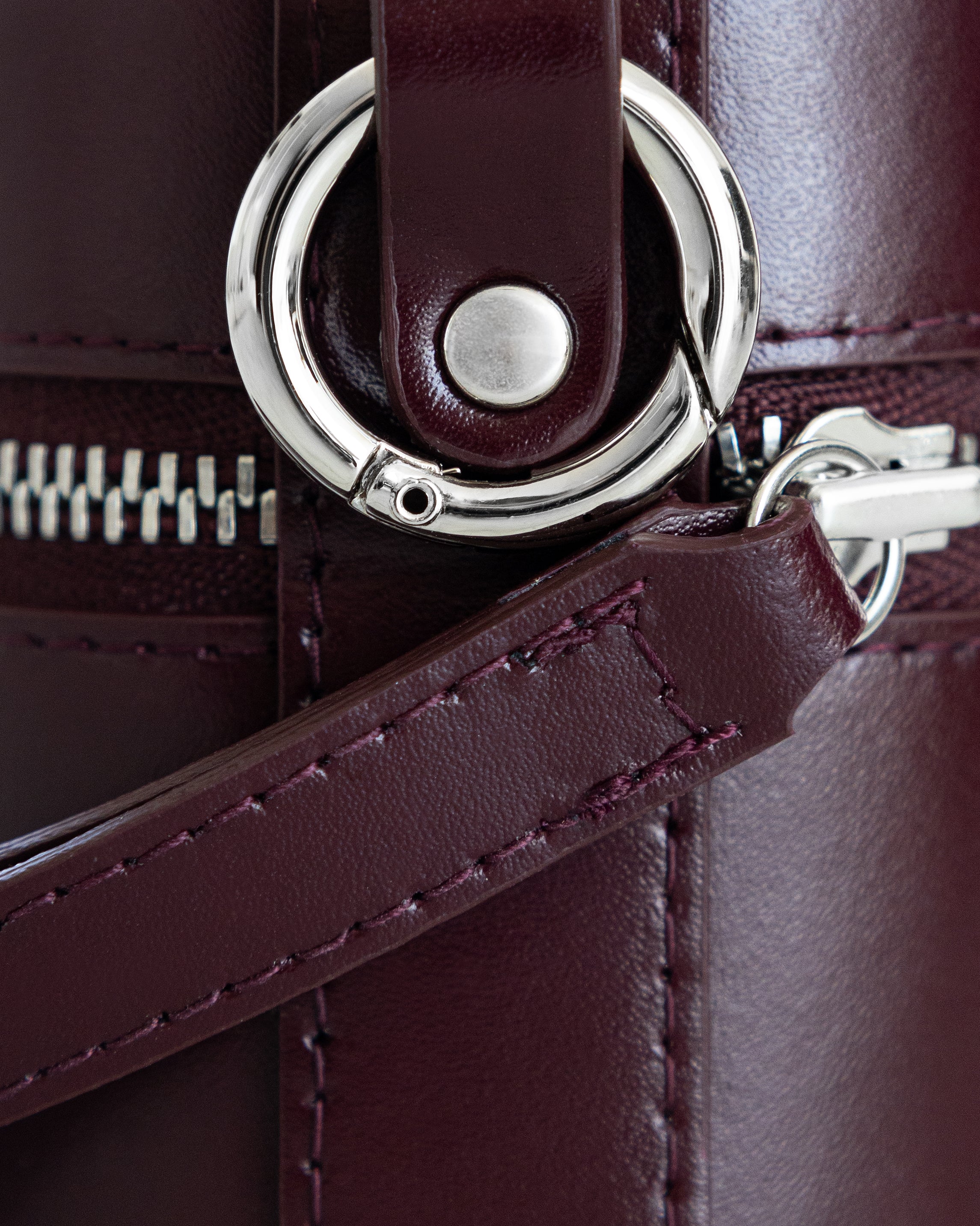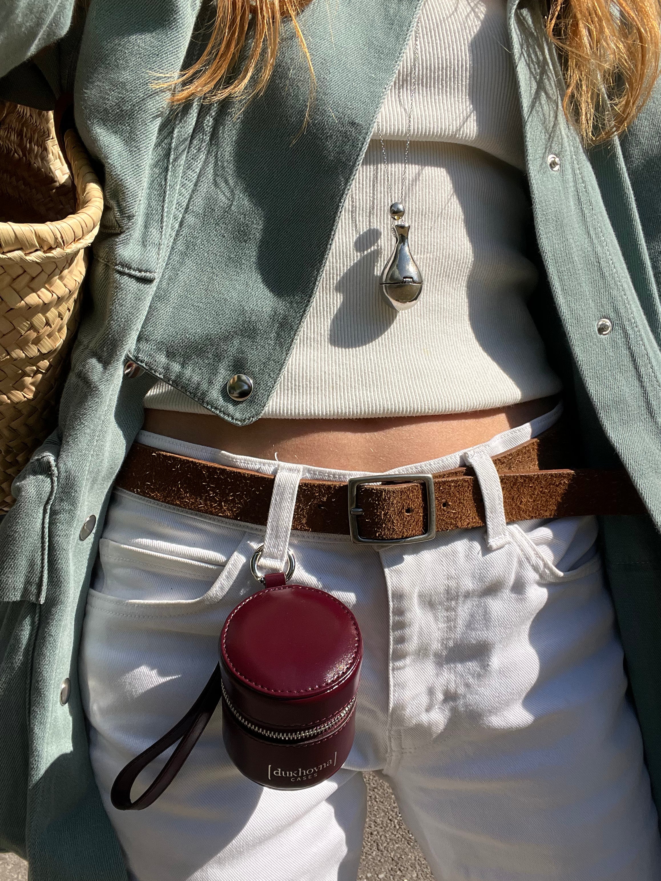 Вишнева натуральна шкіра та персикова велюрова підкладка. Для зборів на пробіжку, тренування чи до басейну. Впевнено вміщує кілька витончених прикрас або сміливі сережки та ефектне кольє. Або ж використовуйте його для ключів від машини та невеликого флакона парфумів.